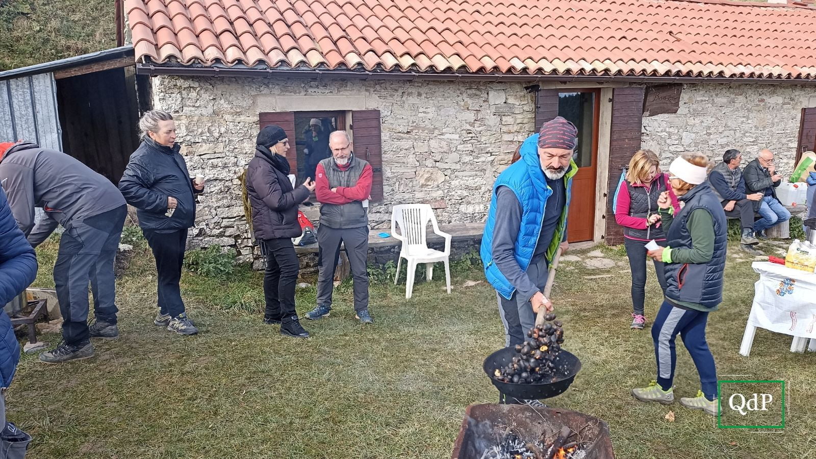 E adesso chi riparte più? Tocca, tocca! Forza! Rimettersi in marcia, sempre pian pianin! Quindi giù per sentieri e strade silvo-pastorali e boschive, “tirate a lucido” dai Servizi Forestali, verso l’ultima salitella di pochi minuti che porta al bivacco e alla malga Mont. Arriva il momento più bello: pie sot la tola e se se scalda co’ un’ombra de vin brulè e, finalmente, se impignis la panzha tutti insieme. Menù senza catàr radéghi: pasta e fasoi con crostini e radicchio trevigiano condito con l’aceto, formaggio, pan e sopressa, zucca, maroni de Combai coti in te la rostidora, torte fin a sciopàr, caffè co’ la snàpa (grappa, ndr) e, ovviamente, mele immerse nella caliera di vin brulé.