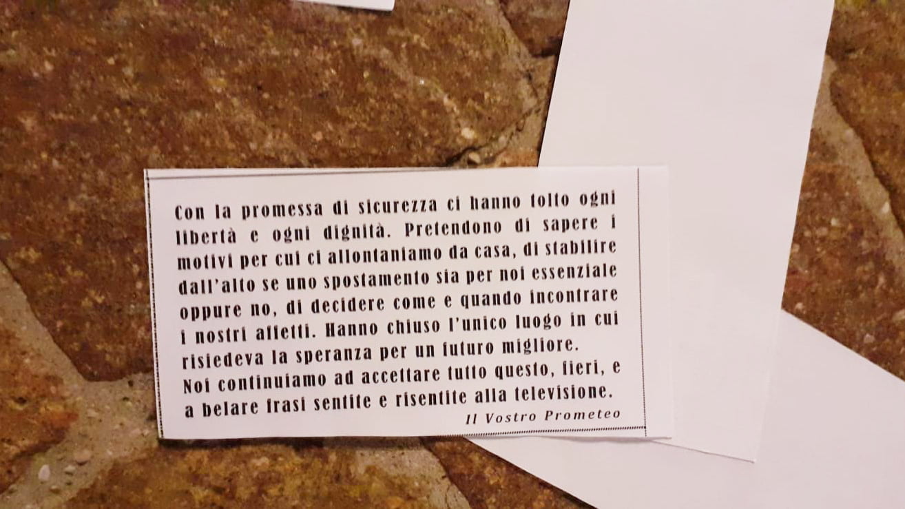 Il messaggio de “Il Vostro Prometeo” è rivolto al governo e contro le misure anticovid fin qui messe in atto: “Con la promessa di sicurezza ci hanno tolto ogni libertà e ogni dignità – scrive il misterioso montebellunese che si ispira al personaggio della mitologia il cui nome significa ‘colui che riflette prima’ -. Pretendono di sapere i motivi per cui ci allontaniamo da casa, di stabilire dall’alto se uno spostamento sia per noi essenziale oppure no, di decidere come e quando incontrare i nostri affetti. Hanno chiuso l’unico luogo in cui risiedeva la speranza per un futuro migliore. Noi continuiamo ad accettare tutto questo, fieri, e a belare frasi sentite e risentite alla televisione”.