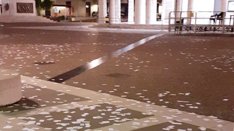 Migliaia di fogliettini bianchi, intorno alle 5 di questa mattina, sabato 22 maggio, sono stati rinvenuti dai carabinieri di Montebelluna, sotto la guida del comandante capitano Gabriele Favero, mentre stavano effettuando le operazioni di bonifica in vista del passaggio del Giro d’Italia. Avvisati gli operatori di Contarina, sono stati prontamente rimossi, ripulendo la piazza.