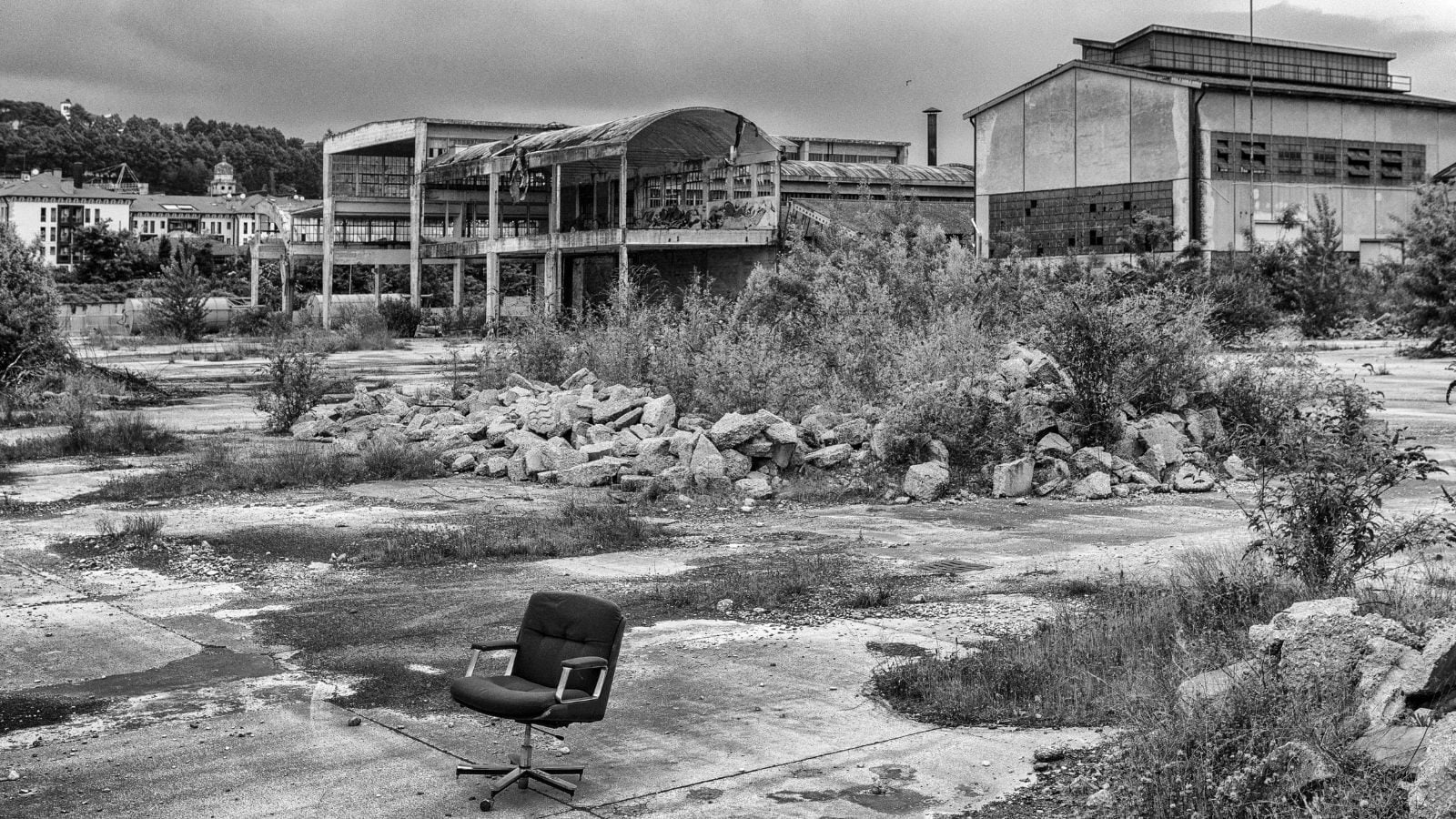 L’immagine più “metafisica” e dal grande potere evocativo è quella che immortala una poltrona d’ufficio abbandonata in un piazzale in cemento, dove fra le crepe crescono erbacce, mentre sullo sfondo si erge un edificio industriale degli anni Cinquanta, ormai da