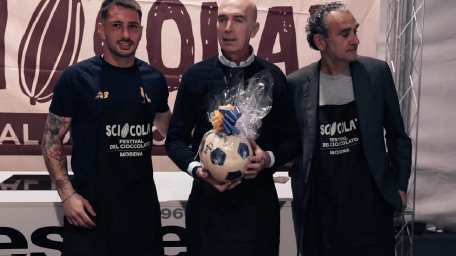 Nei giorni scorsi è stato consegnato un pallone di dimensioni reali di cioccolato dalla Dolcem-Ciccolateria Modenese dal 1954 in occasione della quarta edizione di Sciocolà (Festival del Cioccolato a Modena), manifestazione promossa da Cna, al montebellunese e portiere del Modena Riccardo Gagno (a sinistra nella foto), per la grande impresa dello scorso 9 aprile, quando un gol di 80 metri all’ultimo minuto portò la squadra emiliana alla vittoria decisiva per la promozione in Serie B dopo sei anni (qui l’articolo).