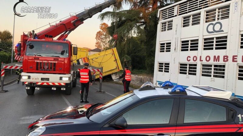 Uscito illeso il conducente del mezzo, ma ad avere la peggio sono stati i circa quindici vitelli morti in seguito al ribaltamento. Sul posto i Carabinieri di Montebelluna che oltre a ricostruire la dinamica del sinistro hanno chiuso sia Castellana che la Bassanese nel tratto interessato.
