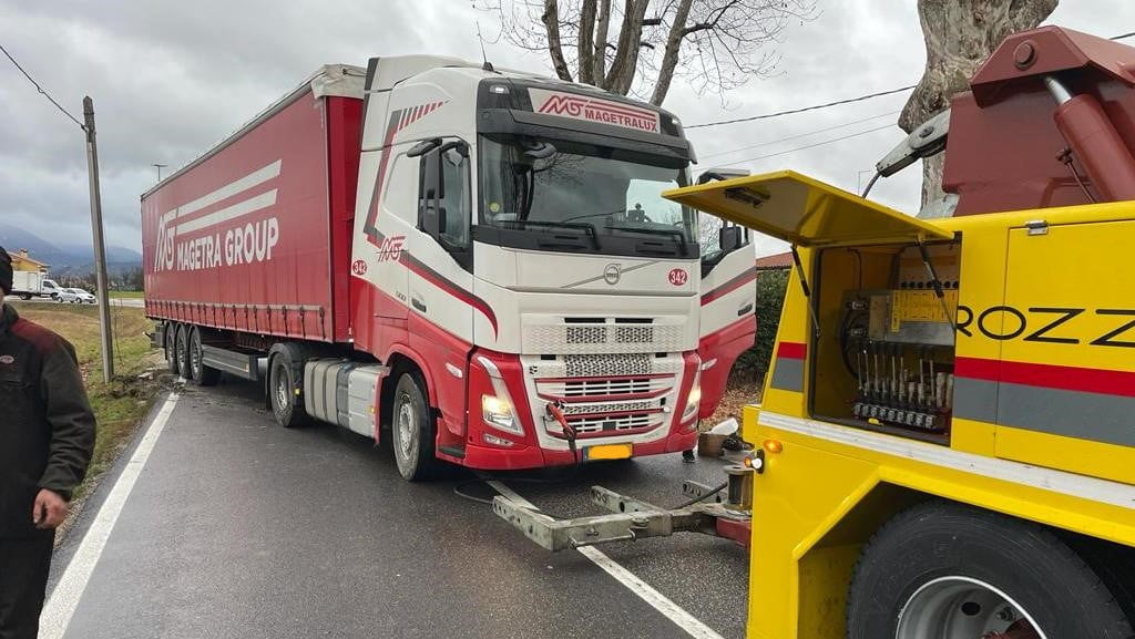 Intorno alle 15 di oggi venerdì un camion Volvo con targa belga è uscito di strada sulla Strada provinciale 84, poco prima del cavalcavia della Feltrina sulla strada che da Covolo porta a Cornuda.