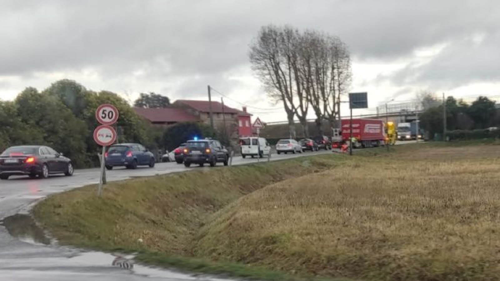 La ruota slitta, camion fuori strada. Auto si ribalta e finisce in un campo