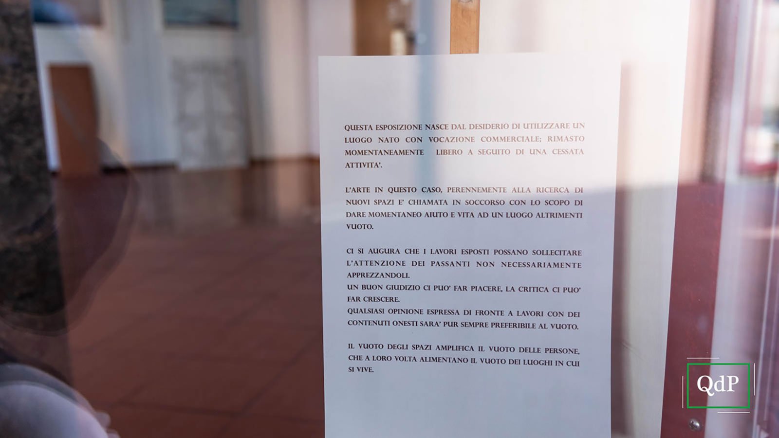“L’arte in questo caso, perennemente alla ricerca di nuovi spazi, è chiamata in soccorso con lo scopo di dare momentaneo aiuto e vita ad un luogo altrimenti vuoto. Il vuoto degli spazi amplifica il vuoto delle persone che a loro volta aumentano il vuoto nei luoghi in cui si vive” si legge sul foglio affisso in vetrina.