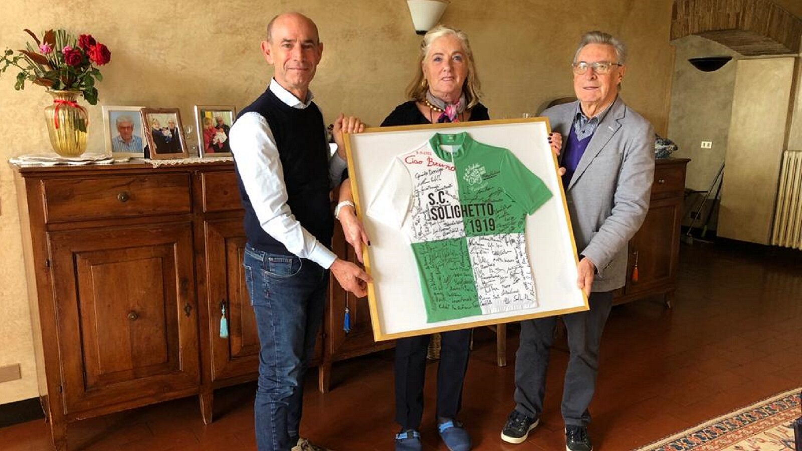Dopo il vuoto lasciato dalla sua scomparsa, la S.C. Solighetto 1919, nelle persone dell’attuale presidente Raffaele Mazzucco e del past president Guido Dorigo (colui che, nel 1999, aveva ricevuto il testimone della presidenza proprio dalle mani di Ferracin) hanno voluto omaggiare ancora una volta il ricordo di questo grande personaggio consegnando alla moglie Maria Grazia una maglia della S.C. Solighetto, nella classica e storica livrea a scacchi bianco-verdi (in foto), autografata da tutti gli atleti, i dirigenti, gli amici e i simpatizzanti della società sportiva che Bruno Ferracin ha contribuito a far crescere con la sua straordinaria passione e dedizione.