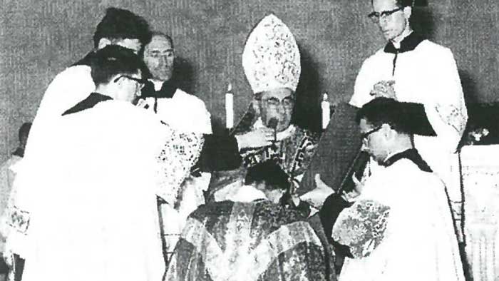 Cinquant’anni di sacerdozio per don Giuseppe Nadal, parroco di Pieve di Soligo, Solighetto e Refrontolo. Era il 29 giugno 1968 quando don Giuseppe, allora 25enne, venne ordinato prete (nella foto sopra) nel suo paese natale, Santa Maria del Piave. Una giornata speciale, a maggior ragione se si pensa che a celebrare la messa di ordinazione fu monsignor Albino Luciani, che dieci anni più tardi sarebbe passato alla storia con il nome di Papa Giovanni Paolo I.