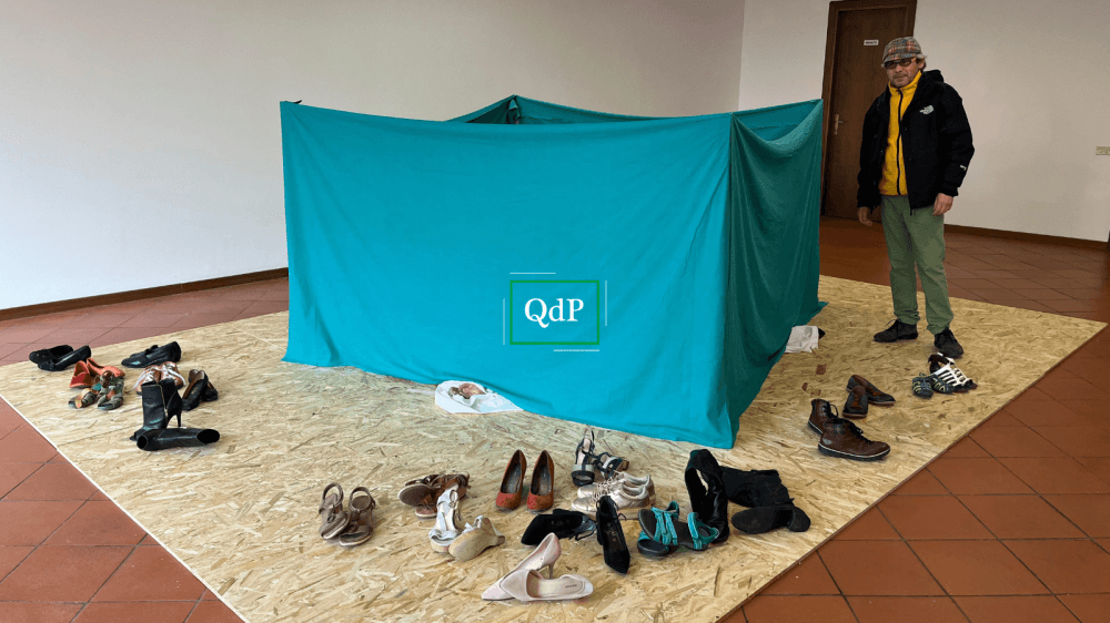 “Questa istallazione è formata da cinque elementi che cercano di rappresentare, nel modo meno cruento possibile e più semplice possibile, la scena di un femminicidio – spiega l’autore – La semplicità non vuole minimizzare l’efficacia dell’immagine, ma al contrario rafforzarla. Quattro teli ospedalieri chiudono a quadrato la scena delittuosa, impedendo ai passanti la vista della vittima. Solo una porzione di mano di gesso dipinto e una scarpa faranno simbolicamente intuire la presenza di un corpo, coperto pietosamente da un telo bianco”.