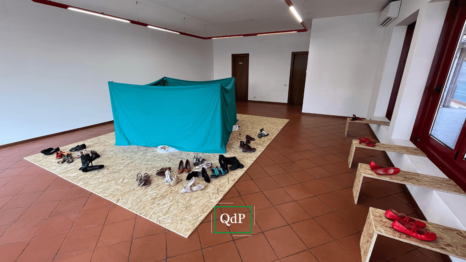 “Il corpo giace su un pavimento, formato da pannelli di OSB, materiale versatile che si presta sia agli usi più umili che alla creazione di sofisticate strutture di arredo – prosegue Bianco – L’ampio spettro di utilizzo di questo materiale si presta a simboleggiare l’altrettanto ampio, se non totale, spettro sociale interessato dal fenomeno della violenza di genere. A poca distanza, sul pavimento, giace un paio di scarpe che simboleggiano il vuoto lasciato dalla vittima. Le scarpe rosse esposte sono il simbolo, oramai classico, della lotta contro i crimini di genere e, in questa circostanza, un omaggio all’architetto e artista messicana Elisa Chauvet, ideatrice nel 2009 dell’opera “ Zapatos Rojos”, nata per denunciare i femminicidi perpetrati nel 1993 nella cittadina messicana di Ciudad Juàrez”.