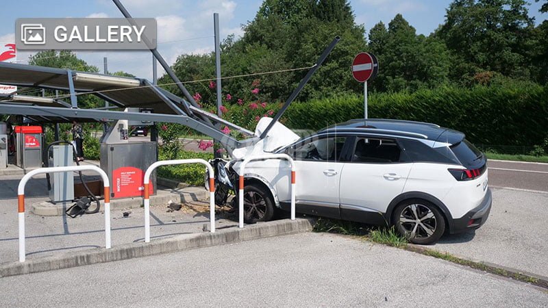 Incolume il guidatore a bordo di una Peugeot 3008 che oggi, sabato 22 agosto, a mezzogiorno, in via Crevada a Refrontolo, si è schiantata contro la tettoia del lavaggio automobili del distributore Energyca.