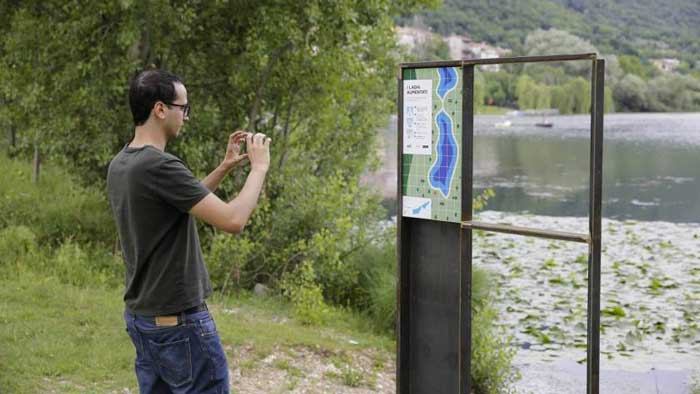 Semplicemente sul sentiero lungo la sponda nord dei laghi sono state posizionate cinque installazioni permanenti costituite da una cornice metallica che inquadra uno scorcio di lago affiancata da un pannello grafico informativo che funge da attivatore e se visualizzato con la fotocamera da vita ad un’animazione digitale creata per quel paesaggio.