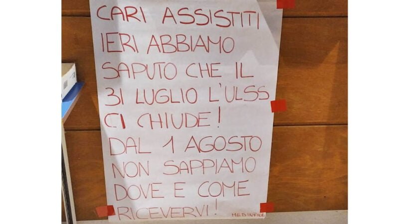 Fuori dalla struttura i medici hanno appeso un cartello con la scritta: “Cari assistiti, abbiamo saputo che il 31 luglio l’Ulss ci chiude. Dal primo agosto non sappiamo dove e come ricevervi”.