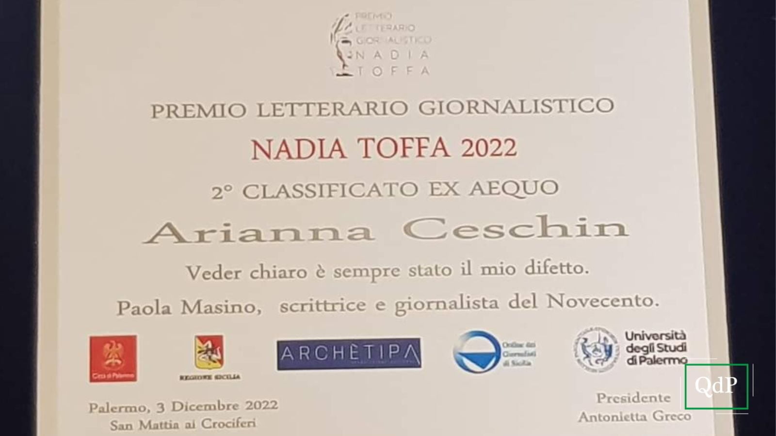 Soddisfazione per Arianna Ceschin, giornalista pubblicista del quotidiano Qdpnews.it e Cultrice della materia al Dipartimento di Studi Umanistici dell’Università Ca’ Foscari di Venezia: si è aggiudicata un secondo posto ex aequo al Premio giornalistico letterario “Nadia Toffa”.