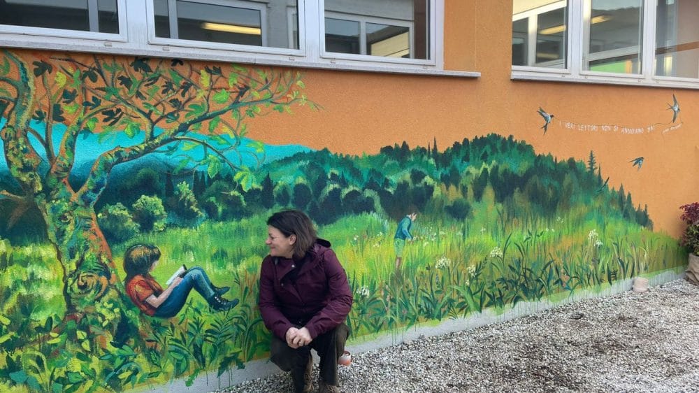 Il percorso è quindi proseguito nell’autunno 2025, con la realizzazione di un murale nel giardino interno della scuola, dedicato al tema della lettura all’aperto.