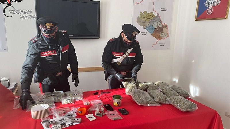Cinque chili di marijuana, hashish, olio di hashish, cocaina, ecstasy, materiale da taglio e confezionamento, un vero e proprio bazar della droga è stato scoperto nel corso di un blitz antidroga dei carabinieri nella serata di ieri a San Vendemiano.