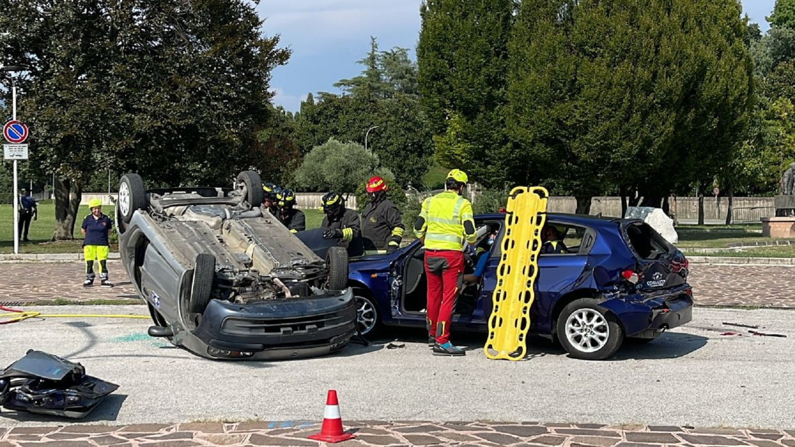 Momento clou, la simulazione di un incidente che ha visto coinvolte due auto ed una bicicletta con il ferimento di due persone ed il decesso (simulato!) di un’altra. In questo caso i ragazzi hanno potuto assistere alle operazioni di soccorso con la chiamata al 118, l’arrivo di Pedemontana Emergenza e dell’elisoccorso, dei Vigili del Fuoco di Asolo e della Polizia locale.