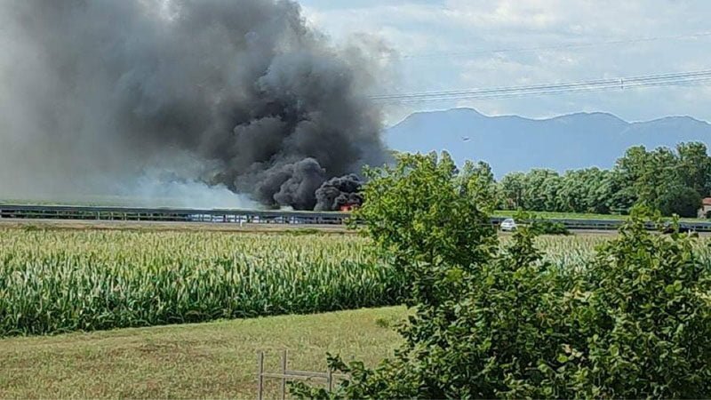 Auto in fiamme alle 17.17 di oggi, domenica 18 luglio, al chilometro 32 dell’autostrada A27 Venezia-Belluno, in direzione Venezia.