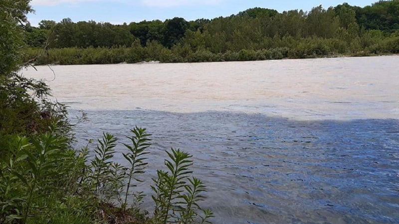 In una foto scattata ieri, martedì 9 giugno 2020, da Legambiente Sernaglia si nota come l’acqua di risorgiva delle Fontane Bianche è rimasta invariata nella colorazione e nella sua densità rispetto alla corrente del fiume Piave a Falzè di Piave, Sernaglia della Battaglia.