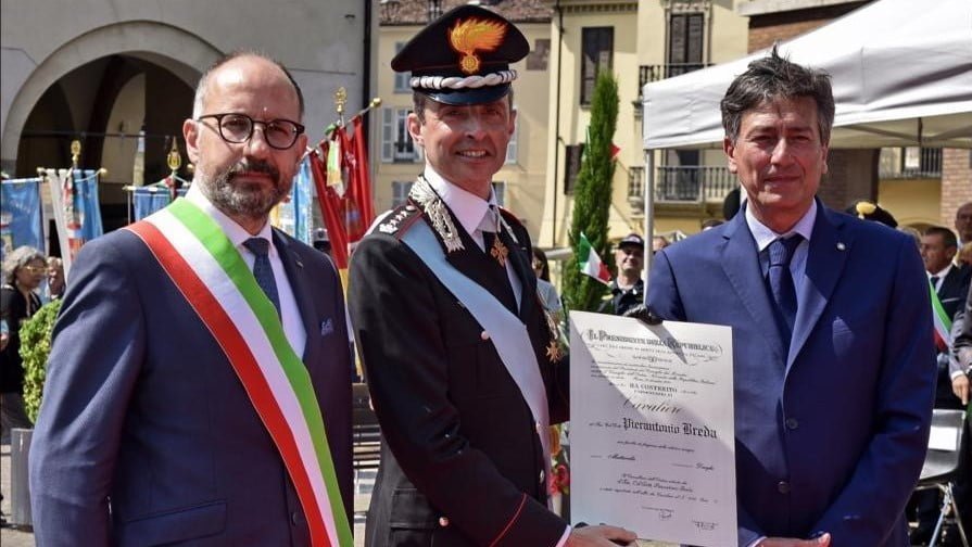 La consegna del riconoscimento – per la sua altissima professionalità, senso del dovere e tenacia nell’affrontare al meglio i compiti imposti dal suo ruolo di vertice – è avvenuta nella mattina di oggi giovedì 2 giugno in occasione della cerimonia celebrativa del 76esimo anniversario della Repubblica tenutasi in Piazza San Secondo ad Asti, dove Breda presta servizio come Comandante provinciale dei Carabinieri. È stato proprio il neo prefetto della città piemontese Claudio Ventrice (nella foto, a destra) a consegnare la pergamena a Breda, ritratto sorridente nelle foto di rito anche accanto al sindaco di Asti Maurizio Rasero.