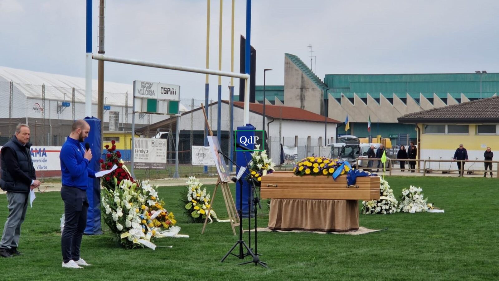 Un campo dove si sono succedute le persone che hanno ricordato il 24enne, condividendo ricordi di vita e di sport, di fronte ai compagni di squadra, affranti dal dolore.