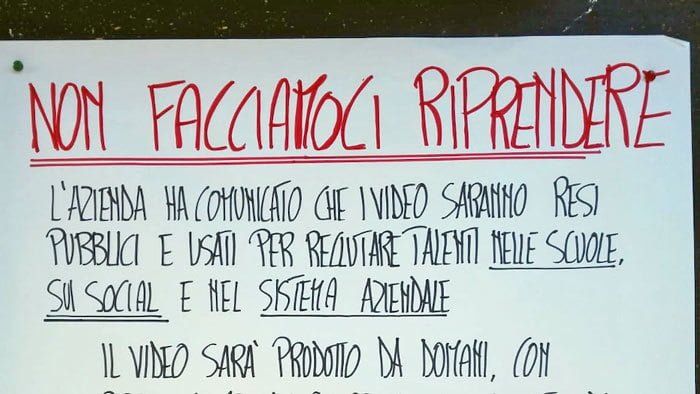 Dopo l’incontro il fatidico cartello “Non facciamoci riprendere. L’azienda ha comunicato che i video saranno resi pubblici e usati per reclutare talenti nelle scuole, sui social e ne sistema aziendale. La Rsu ha dato parere negativo e chiesto di rinviare l’avvio eventualmente a dopo la ricezione di ulteriori dettagli. Invitiamo i lavoratori a non firmare nulla e rifiutare ogni ripresa”.