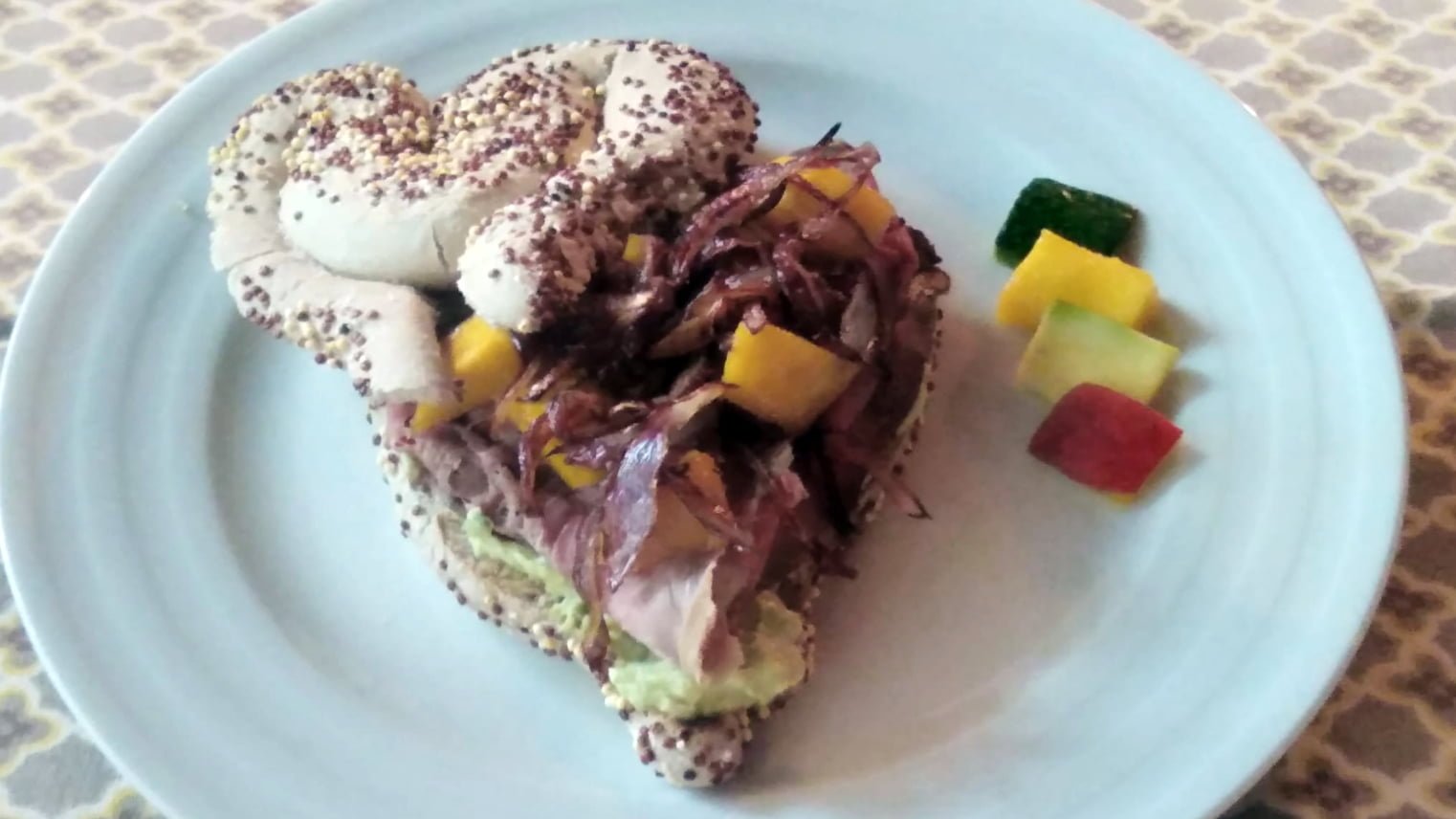 Il panino proposto dal Burger Time per il concorso “Artista del Panino”, chiamato “Armonia tropicale”, è fatto con un pane al melograno con quinoa rossa e miglio ed è farcito con pastrami di manzo, chips di Tropea, mango caramellato e mousse di ricotta e avocado.