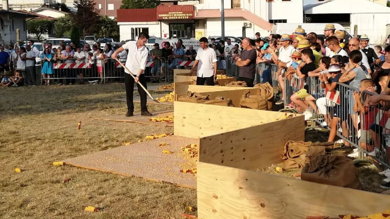 La competizione, che recupera un’importante fase dell’annata agraria della tradizione rurale locale, consiste nel raccogliere da un mucchio le pannocchie di mais, trasportarle di corsa servendosi di una cesta fino al palco, dove vengono sgranate con la vecchia macchina che veniva utilizzata in passato nelle campagne venete.