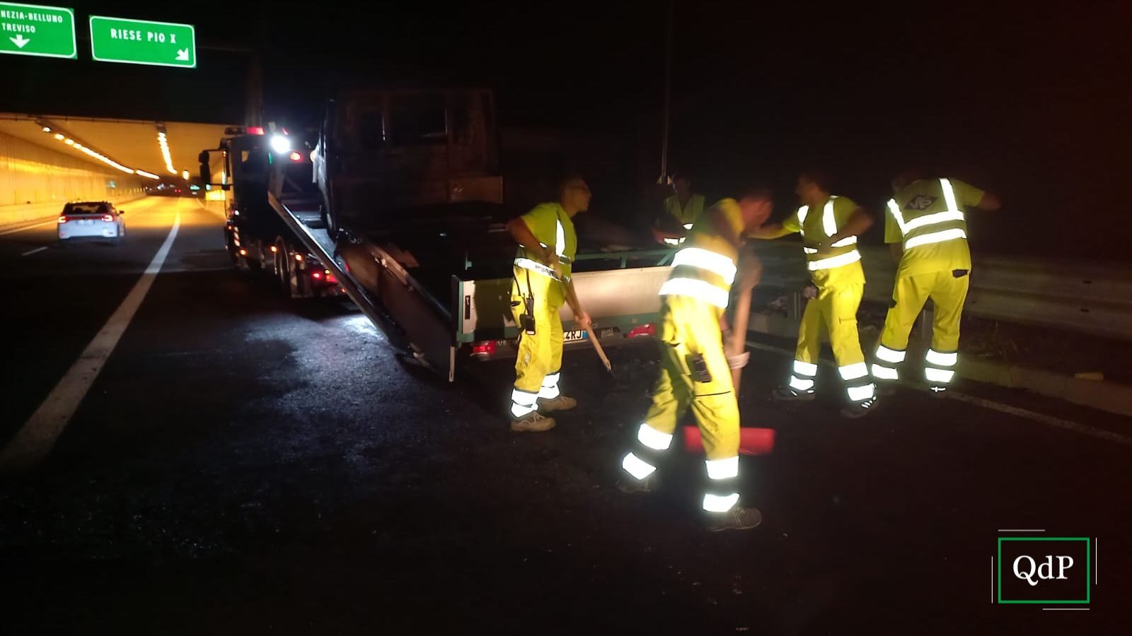 Il conducente, che viaggiava verso Spresiano, ha iniziato a sentire che qualcosa all’interno del mezzo non funzionava più correttamente, così ha accostato ed è sceso per controllare. In quel momento – secondo la sua testimonianza – il fuoco ha iniziato a propagarsi, avvolgendo prima il cofano e poi tutto il veicolo.