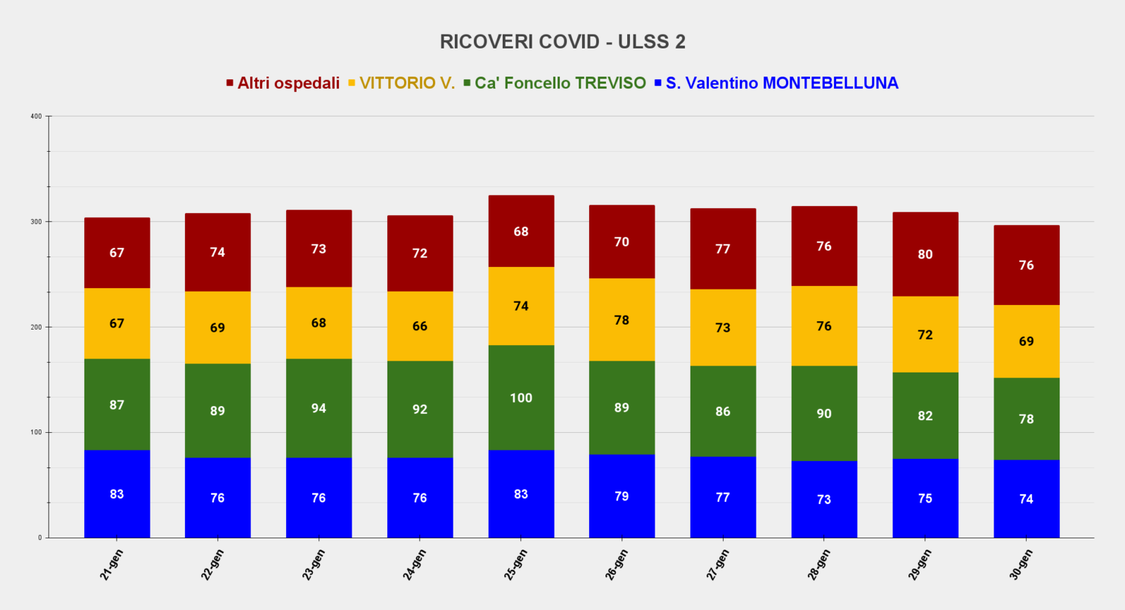 Un lieve miglioramento riguarda anche gli ospedali trevigiani, che hanno toccato il picco di 325 pazienti martedì 25 e sono tornati sotto i 300 nella giornata di domenica.
