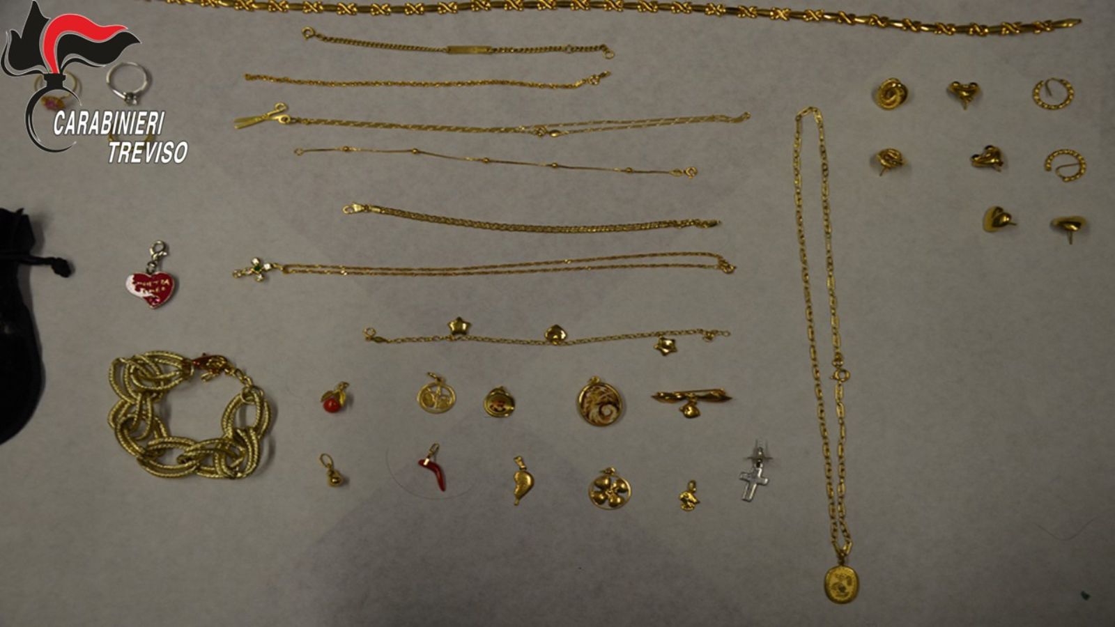 Una successiva perquisizione domiciliare, da cui è emerso che i due stranieri erano ospitati dall’italiano fermato in precedenza, è stata rinvenuta una considerevole quantità di monili in oro (anelli, bracciali, collane, orecchini) – gran parte dei quali riconosciuti come quelli asportati alla vittima del furto in casa – nonché un attrezzo tipo “piede di porco”, due paia di guanti da lavoro ed un berretto sportivo.