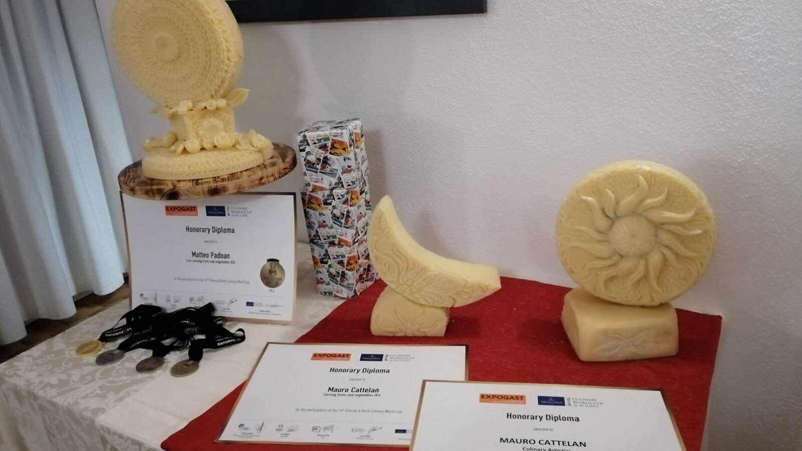 “Abbiamo partecipato ai mondiali di cucina in Lussemburgo – spiega Padoan -, una manifestazione che si tiene ogni 4 anni. Entrambi abbiamo gareggiato nella categoria di opere pronte e salate con i formaggi della Latteria Soligo e abbiamo portato dei vegetali dell’azienda Nonno Andrea intagliati con tecnica thai. Io ho fatto la gara live di intaglio sui vegetali nella quale, in tre ore di tempo, bisognava preparare 5 pezzi. Nella fase di qualificazione ho preso l’oro e nella fase finale il bronzo. Con i formaggi, invece, ho ottenuto la medaglia d’argento”.