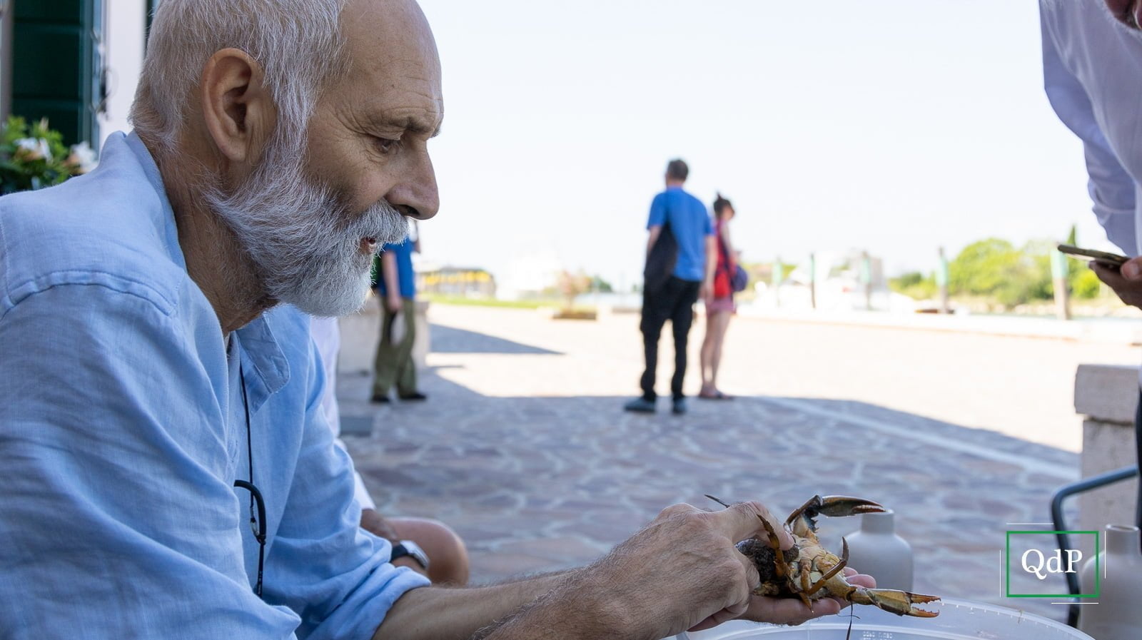 Gianluca Bisol, che ormai conosce bene Torcello e la sua gente, ci porta in barca a conoscere anche un pescatore che potremmo definire leggendario, con gli occhi blu come quelle acque tiepide che la sua famiglia, i Rossi, navigano fin dai tempi della Serenissima: Domenico è stato intervistato dalle maggiori televisioni al mondo, ma nella sua umiltà di uomo di mare e “allevatore di moeche”, ci racconta volentieri il proprio punto di vista sul granchio blu, attraverso concetti che scopriamo essere strettamente legati alla sopravvivenza delle tradizioni della vera pesca di laguna.