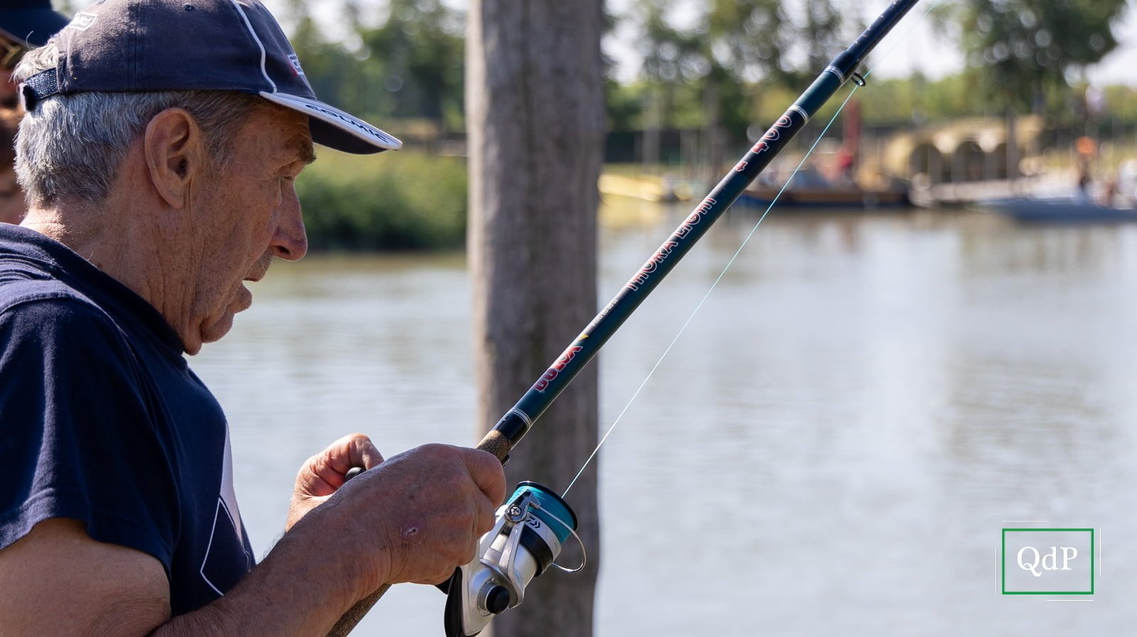 Attracchiamo a un molo dove Stefano e suo padre Albino stanno pescando tranquilli, sotto un cocente sole d’agosto: all’estremità del filo delle loro canne da pesca, come esca, ci sono intere cosce di pollo.