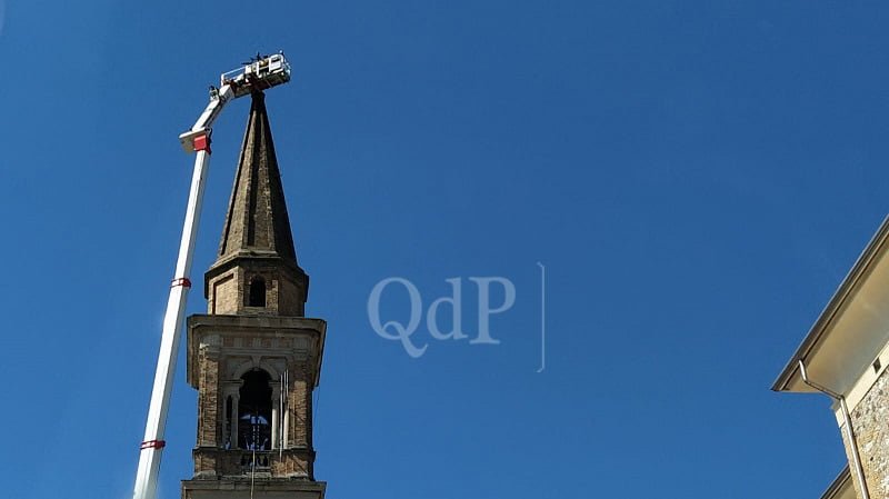 La manutenzione in corso prevede la sostituzione del parafulmine posto sulla punta del campanile e la riparazione del tetto che, a causa dell’impatto con il fulmine, aveva ceduto in alcuni punti e si era andata a creare qualche crepa che favoriva le infiltrazioni d’acqua.