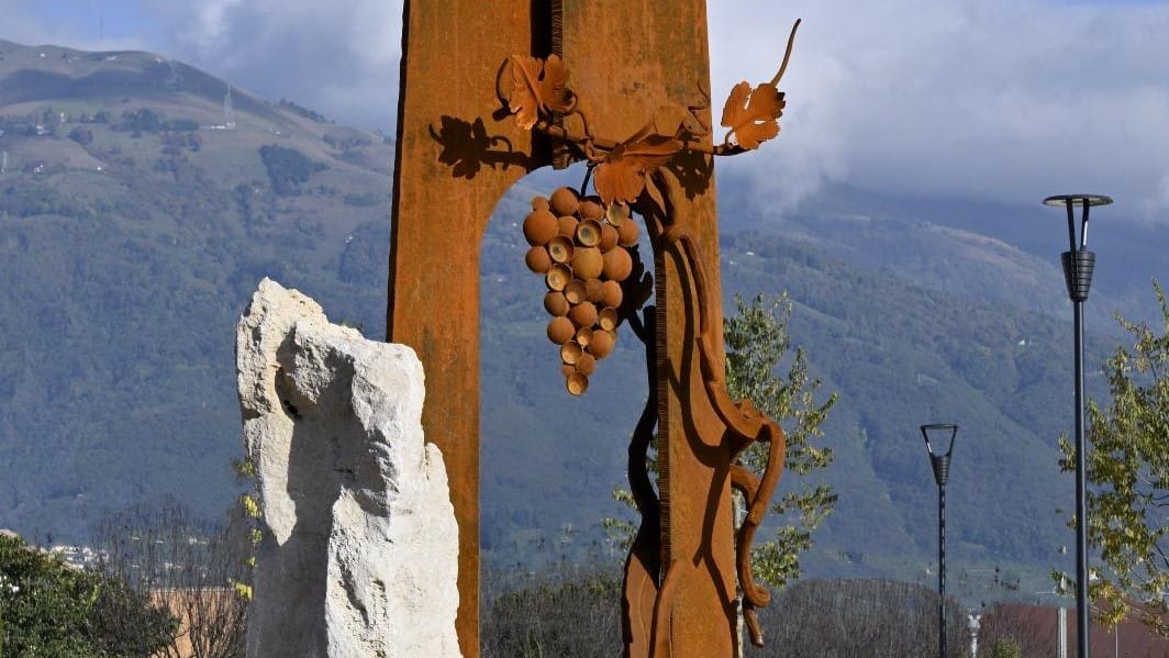 Nello specifico, la scultura è formata da due alte lastre di ferro che si intersecano sulla sommità a formare una merlatura degna dei castelli e delle fortezze medievali. Dalla base di una delle due lastre cresce il fusto di una robusta e sinuosa vite secolare che, avvinghiandosi allo stipite, genera un tralcio con un generoso grappolo d’uva. Una roccia accompagna lo slancio verticale dell’opera a sottolineare la forza e la potenza di una terra coltivata con tenacia, costanza e con mirabile dedizione.