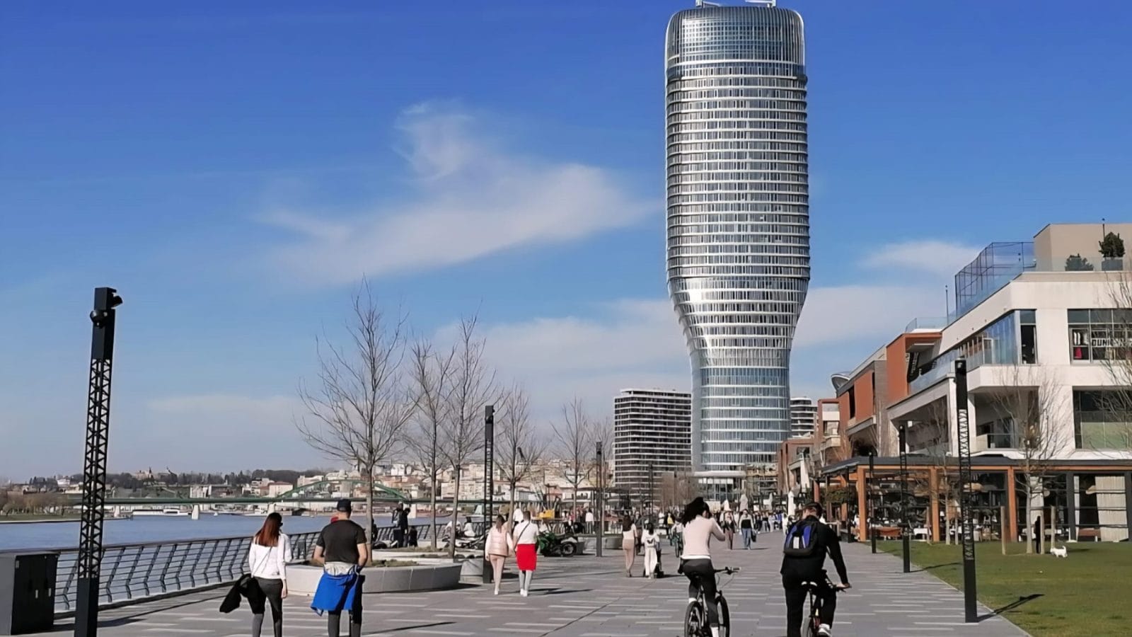 Collocata sul ‘water-front’ della Sava, la torre propone la visione anche del Danubio e, spettacolo unico, delle due bocche di ingresso della Sava nel Danubio. Sui pannelli di vetro della facciata si specchiano i due maestosi fiumi e poco oltre l’imponente Fortezza di Belgrado, offrendo l’illusione di una completa immersione con il paesaggio urbano.