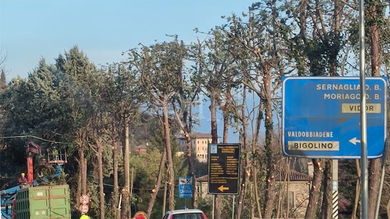 Una nuova visuale può vedere chi percorre la strada provinciale numero 34 che dalla frazione Bigolino di Valdobbiadene conduce a Vidor: ieri, giovedì gennaio 2021, si è svolto il taglio dei rami degli imponenti alberi che costeggiano la carreggiata.