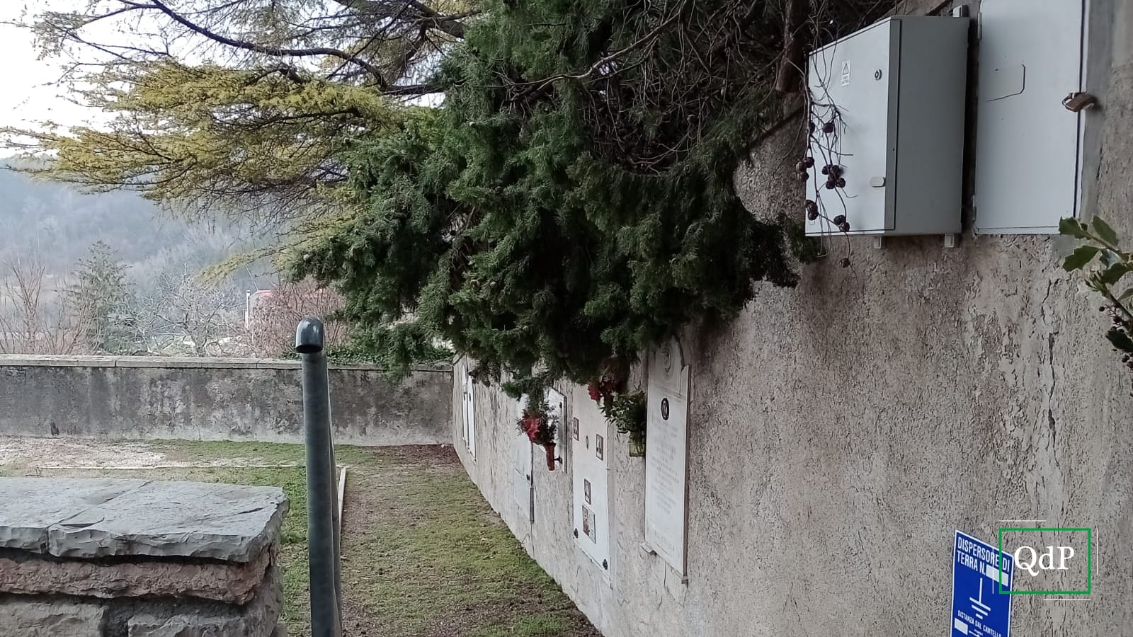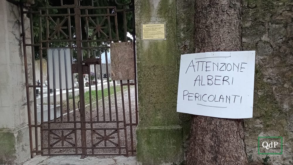 Restano “pericolanti”, come avvisa a chiare lettere un cartello affisso agli stessi e in attesa di futuri interventi, gli alberi esterni al camposanto.