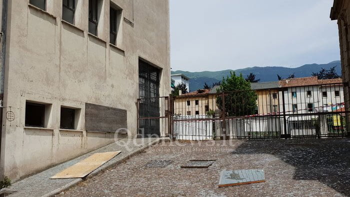 L’esplosione ha causato il danneggiamento dell’edificio scolastico (nella foto) nonché del palazzo posto di fronte, provocando complessivamente la rottura di 32 finestre e di un portoncino.
