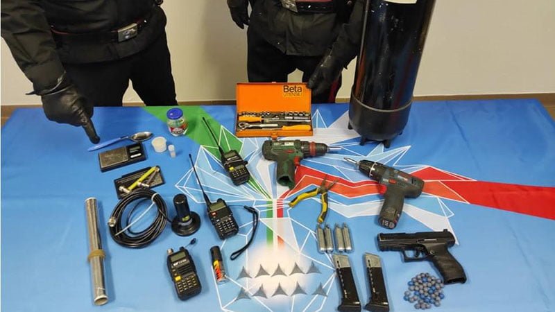 Il trio, a bordo di due Alfa Romeo, è stato trovato in possesso di arnesi da scasso, 3 ricetrasmittenti, una bomboletta di spray urticante, 10 chiodi per foratura pneumatici, una bombola di miscela ossigeno azoto, una pistola ad aria compressa, 4 ricariche d’aria, e 42 pallini in gomma.