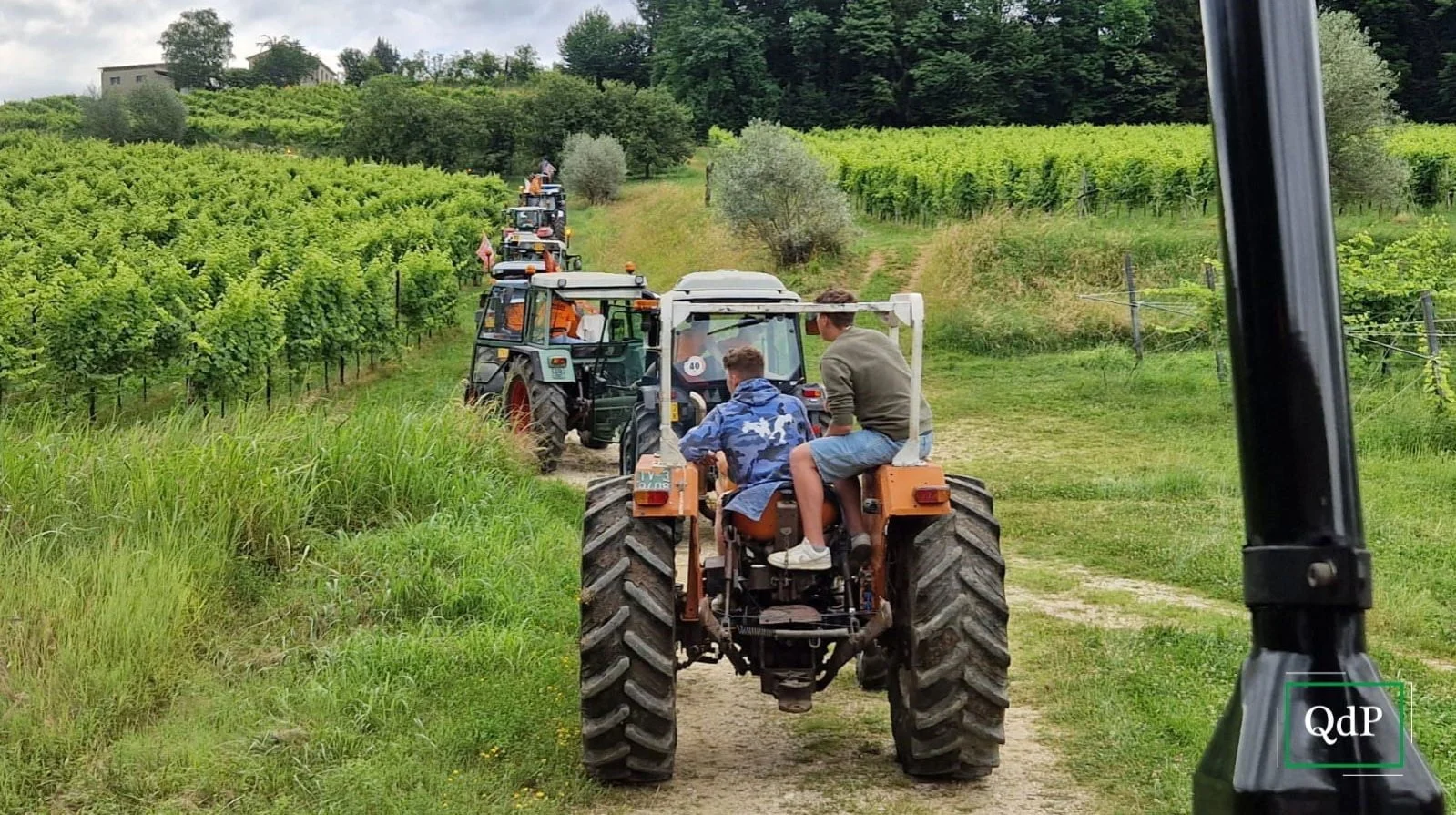 Lungo il tragitto, i volontari distribuiti agli incroci indicano il percorso e segnalano il passaggio dei trattori alle auto in transito, così che tutto si svolga in sicurezza. Il corteo entra nel cuore del paesaggio agricolo: i mezzi attraversano gli scenari coltivati di San Pietro di Feletto, passano per Santa Maria di Feletto, toccano il territorio di Refrontolo e di Collalbrigo, tra le colline di Conegliano, sfilando tra i filari di vigneti e guadando piccoli rivoli d’acqua. Il ritmo è lento, pensato per godersi il panorama almeno quanto la guida.