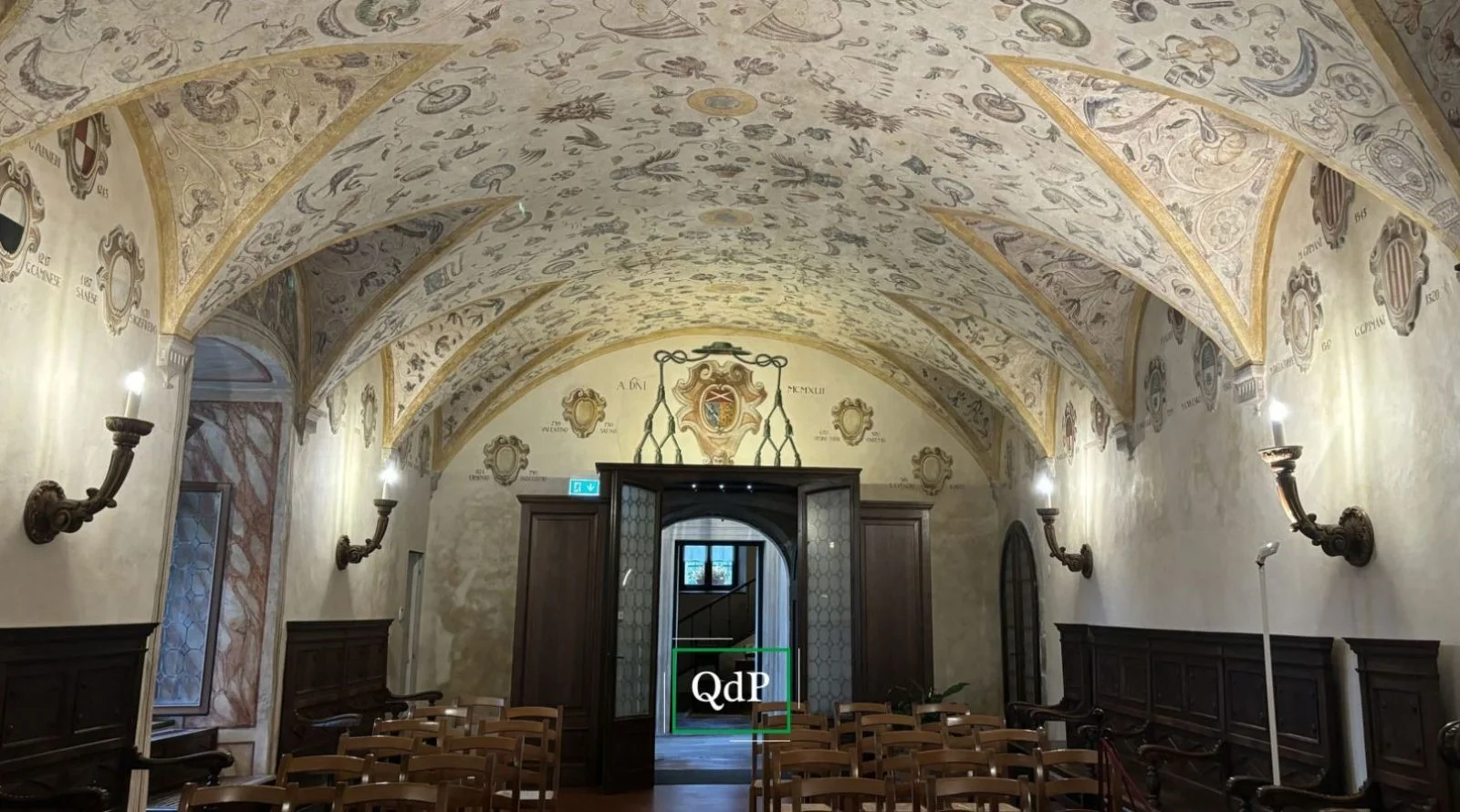 Oggi, entrando nella Sala comitale degli Stemmi, torna evidente l’unità dell’insieme. Si segue la fascia continua delle armi vescovili lungo le pareti, si alza lo sguardo sulla volta decorata, e poi ci si lascia prendere dalla luce che entra dalle finestre affacciate sul paesaggio di San Martino. È uno degli ambienti più significativi del castello, a metà tra funzione rappresentativa e memoria araldica, e si presta anche a ospitare incontri, conferenze e momenti di conoscenza del patrimonio diocesano.