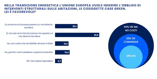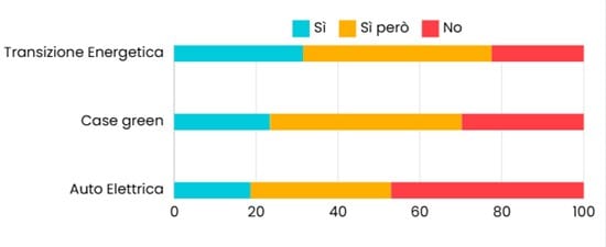 Anche sul tema delle “case green“, ovvero le ristrutturazioni delle abitazioni per migliorarne l’efficienza energetica, quasi il 70% degli italiani si è dichiarato favorevole. Tuttavia, una quota significativa dei votanti (43%) afferma di essere favorevole solo se questi interventi non incidono negativamente sul bilancio familiare. Questo sottolinea l’importanza di sostegni economici da parte dello Stato per facilitare la realizzazione di queste modifiche.