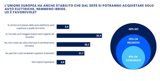 Un tema particolarmente rilevante è quello delle automobili elettriche. A partire dal 2035, il Green Deal dell’Unione Europea prevede lo stop alla produzione delle auto a combustione interna a favore di quelle elettriche. Su questo punto, l’indagine rivela che meno del 50% degli italiani è favorevole all’acquisto di auto esclusivamente elettriche dopo il 2035. Solo una piccola parte (circa il 10%) è disposta ad acquistare un’auto elettrica anche se questa avesse un costo superiore rispetto a un’auto tradizionale. Un ulteriore 35% è favorevole, ma solo se i costi aggiuntivi venissero compensati da incentivi governativi. La maggioranza, invece, non supporta questo cambiamento, percependolo come un contributo insufficiente alla lotta contro il cambiamento climatico.