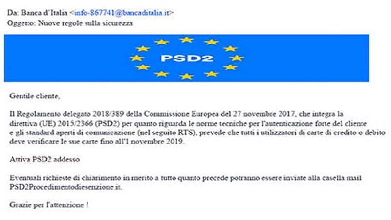 • L’e-mail malevola è volta alla sottrazione indebita dei dati personali delle carte di credito; ha come oggetto “Nuove regole sulla sicurezza” e fa riferimento alla normativa PSD2.