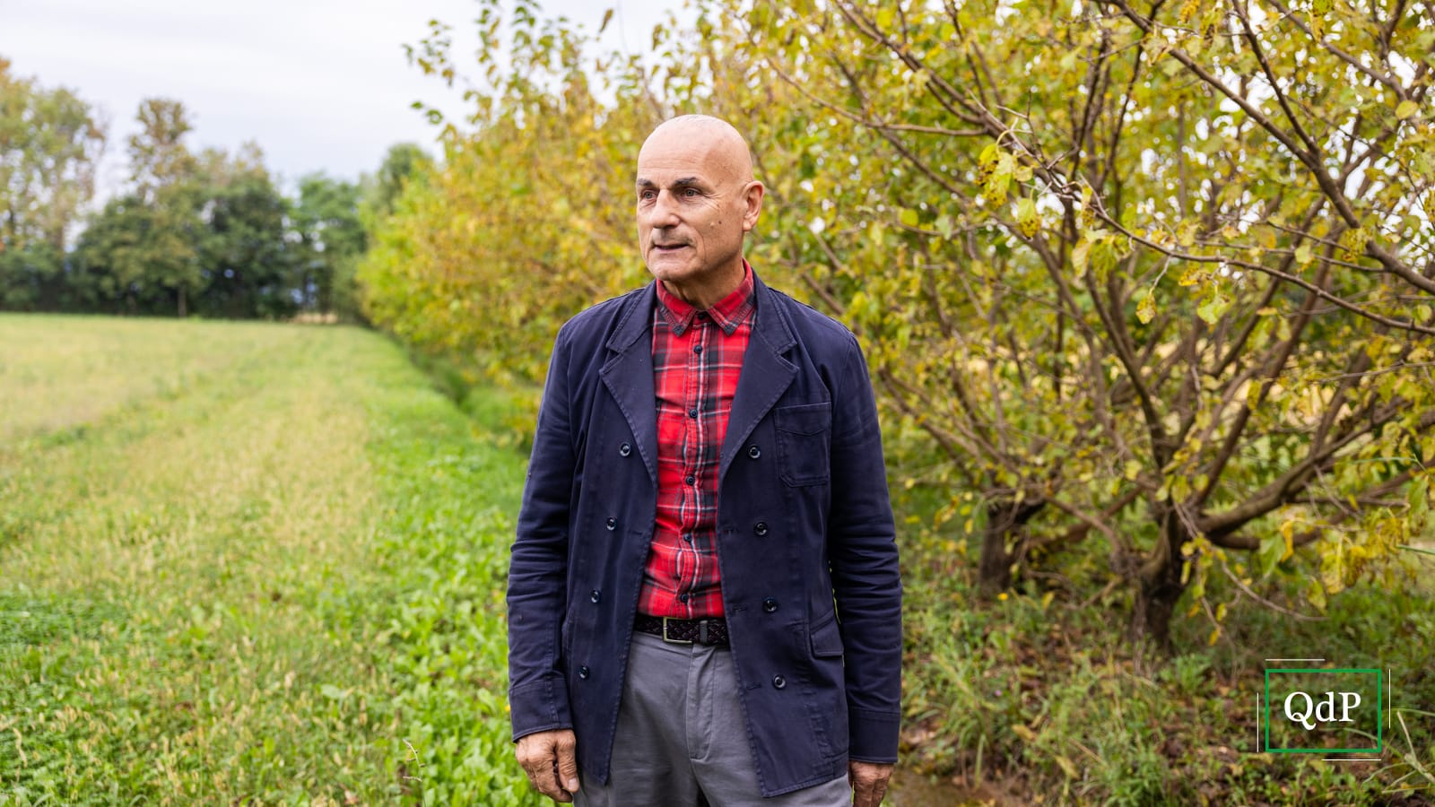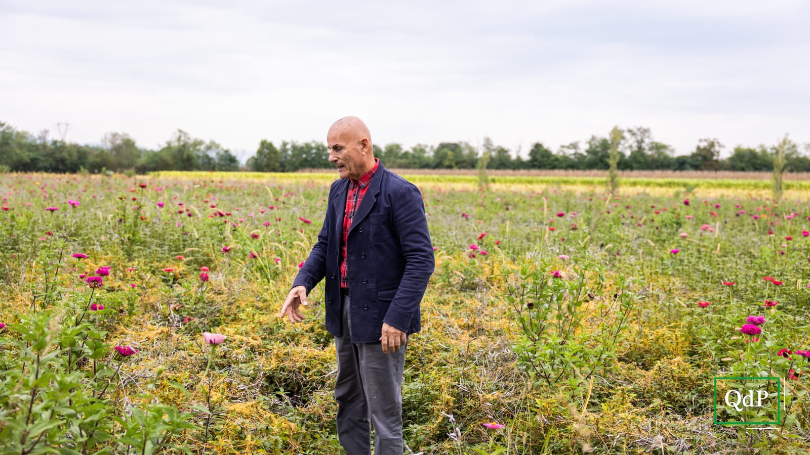 Nella quotidiana perlustrazione dei campi non può mancare una sosta ai limiti di un appezzamento di tre ettari nel quale fioriscono il rafano, la zinnia, la facelia, la ginestrella. Fiorenzo osserva rapito tanta bellezza, ma d’improvviso si affaccia su una roggia, capisce che le foglie la stanno intasando. Si china, apre una chiusa e l’acqua riprende a scorrere libera. C’è ancora molto da fare prima che cali la sera.