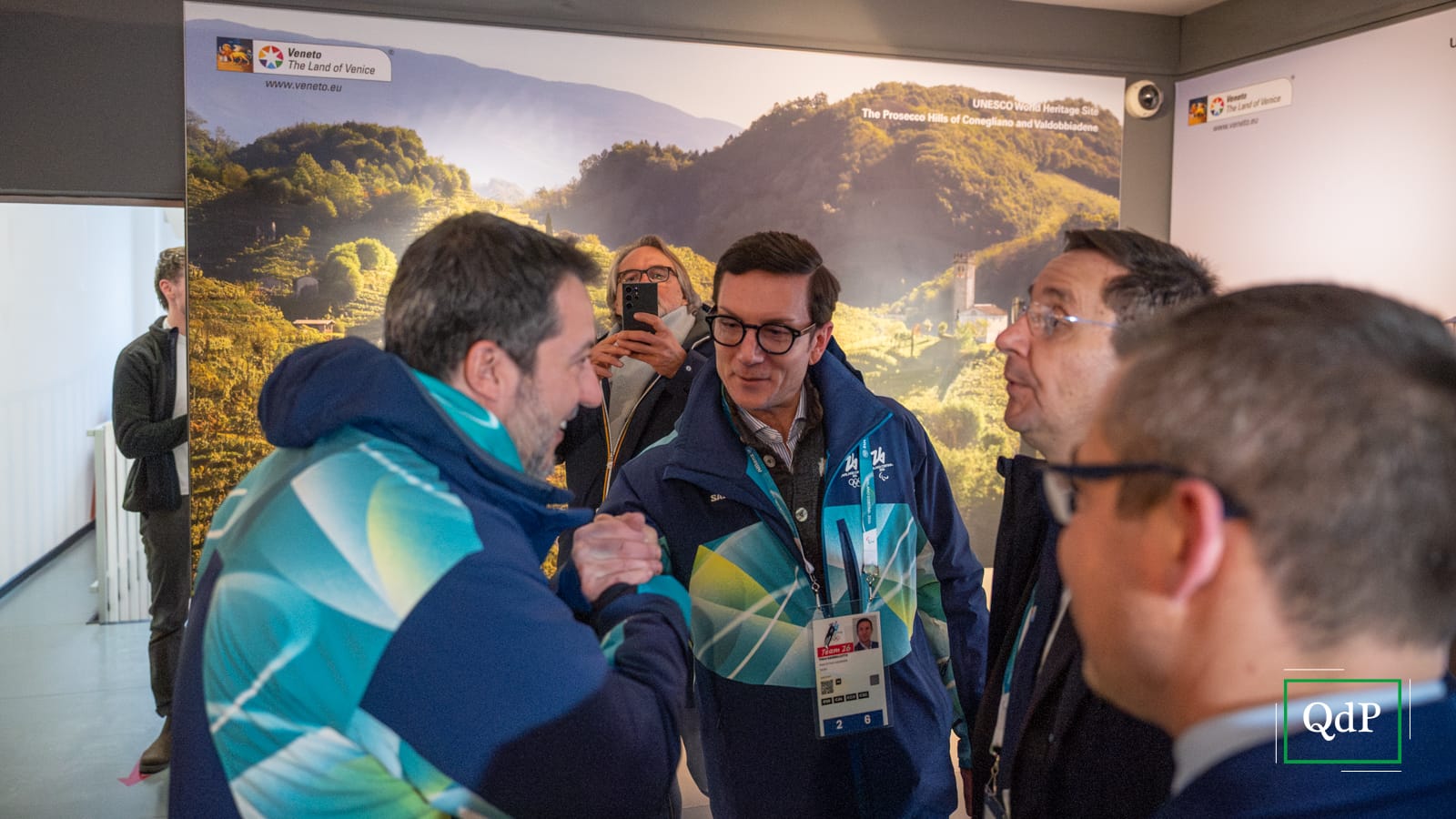La visita è stata anche occasione di incontri e fotografie con il pubblico presente a Casa Veneto: una maglia è stata consegnata al presidente della Regione Alberto Stefani, e non sono mancati gli scatti con il vicepremier Matteo Salvini.