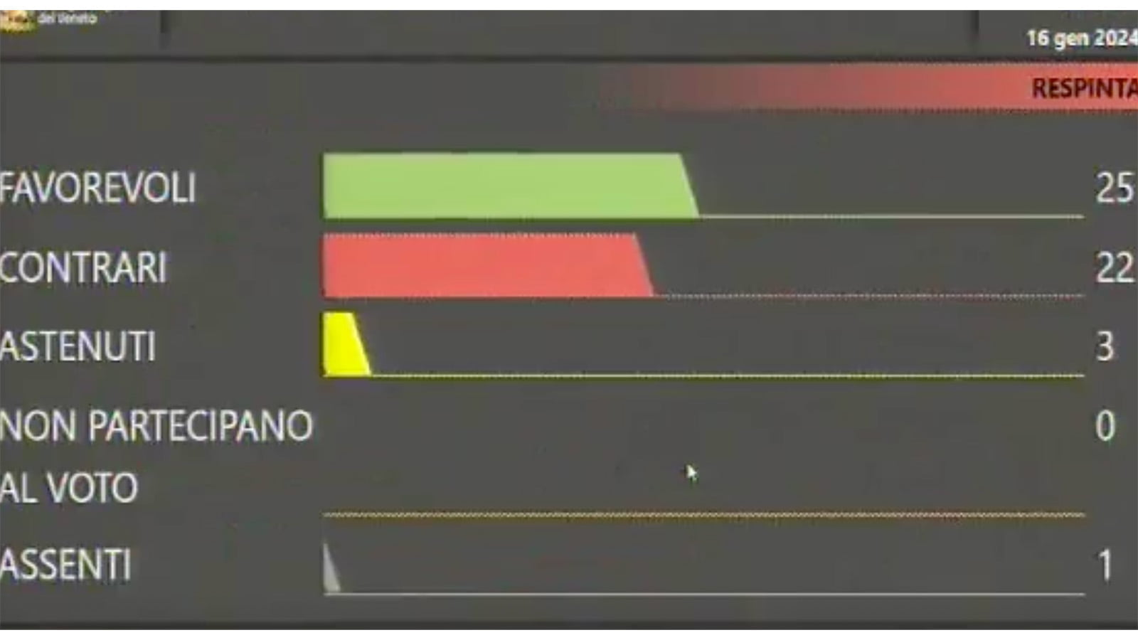 Con 25 voti favorevoli, 22 contrari, tre astenuti e un assente vengono bocciati i primi due articoli del disegno di legge. Dopo una consultazione con il consiglio legislativo il presidente Roberto Ciambetti convoca una riunione con i capigruppo per spiegare la situazione: “questo è un articolo base” afferma. L’articolo due, infatti, è parte fondamentale della legge e senza questo “non sta in piedi. Non essendo approvata una sua parte fondamentale il disegno di legge viene rinviato in commissione”.