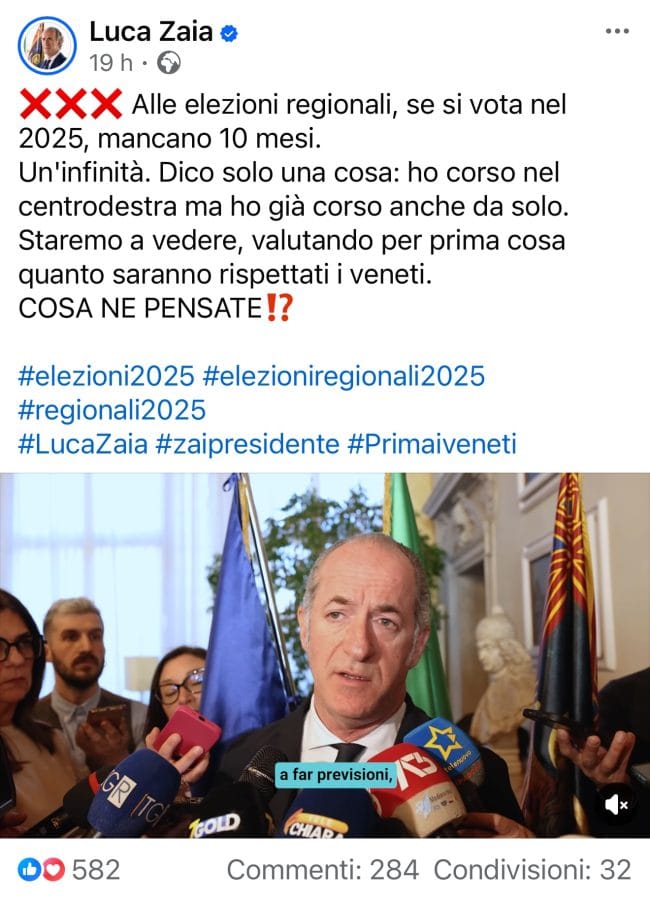 “Alle elezioni regionali, se si voterà nel 2025, mancano 10 mesi. Un’infinità. Ho corso con il centrodestra, ma ho anche corso da solo. Staremo a vedere, valutando per prima cosa quanto saranno rispettati i Veneti. Cosa ne pensate?”