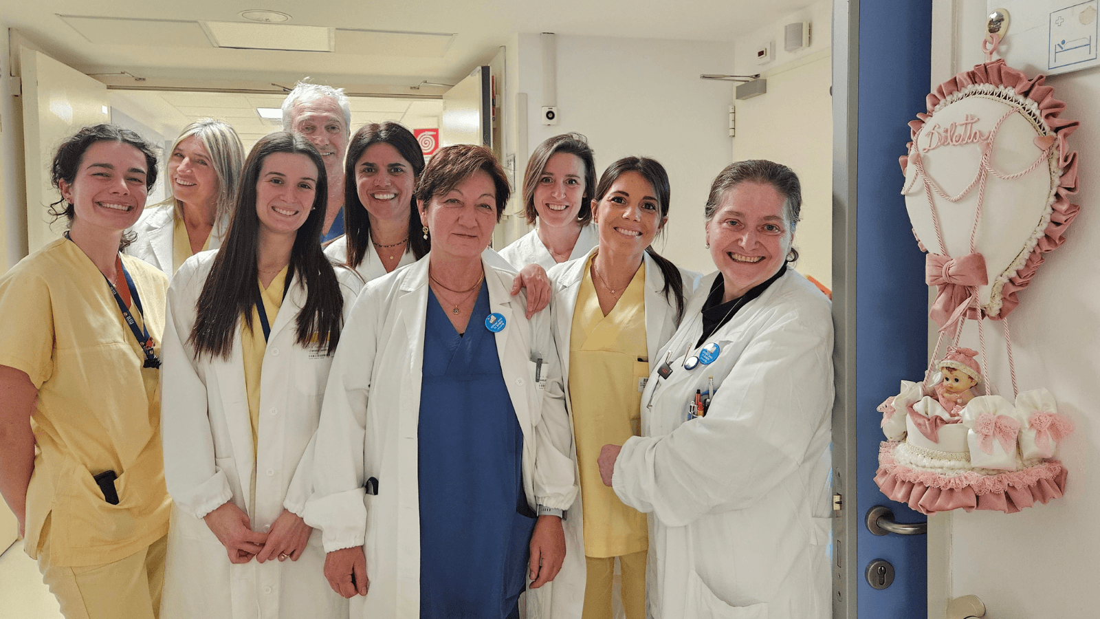 L’equipe ostetrica dell’Angelo in posa accanto a un fiocco rosa. In copertina 14 dei 24 neonati posano in reparto con mamme e papà